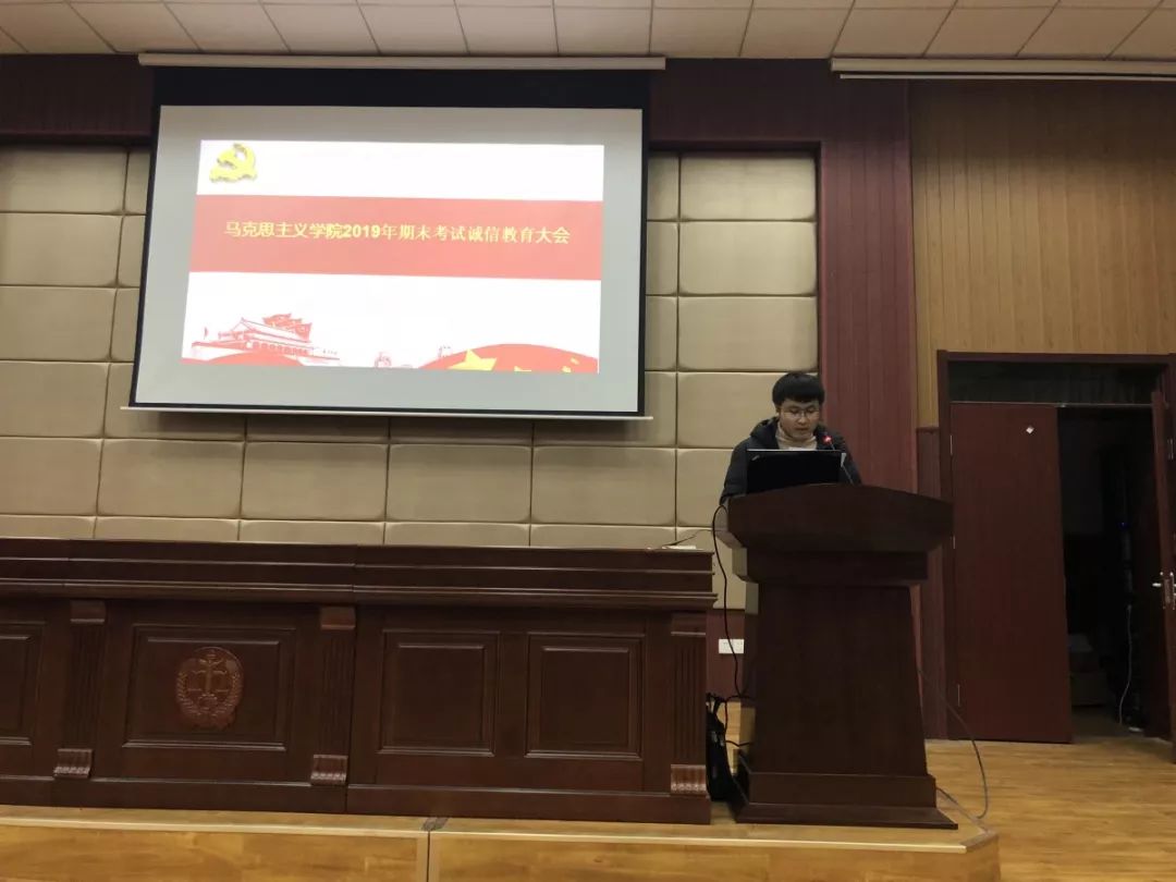 12月27日晚,Beat365官网2019年期末考试诚信教育大会在笃行楼模拟法庭召开,会议由学院辅导员陶征主持,Beat365唯一官方网站全体学生参会,党委副书记徐海春出席本次会议。