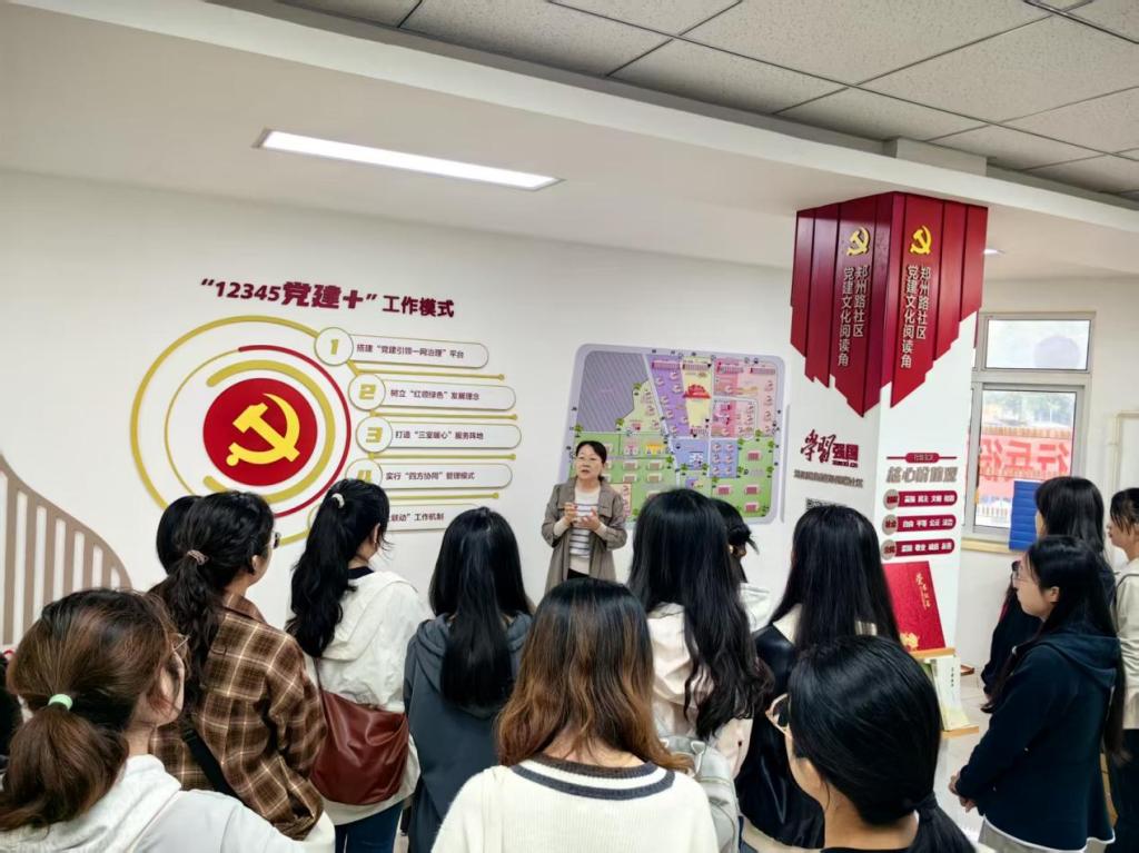 随后,一行人前往新园小区——郑州路社区党建引领老旧楼院治理的标杆项目。王艳芳书记结合实景讲解:“这里曾因停车无序、环境杂乱成为居民‘心头病’。我们以‘12345党建+’为抓手,搭建社区党委、物业、业委会、网格党支部四方协同机制,发动自管党员亮身份、领任务,通过反复议事协商彻底破解‘停车难’。”她还指向远处的共建花园与“里享家”乐修驿站,介绍社区链接“红色合伙人”打造阳光育苗站、落叶堆肥池等生态阵地,组建“红管家”服务队与“欢喜琴社”,成功推动居民从“等服务”转向“主动参与”。从管网改造到文化惠民,治理逻辑与民生细节的结合,让成员清晰看到党建如何激活基层治理“神经末梢”。