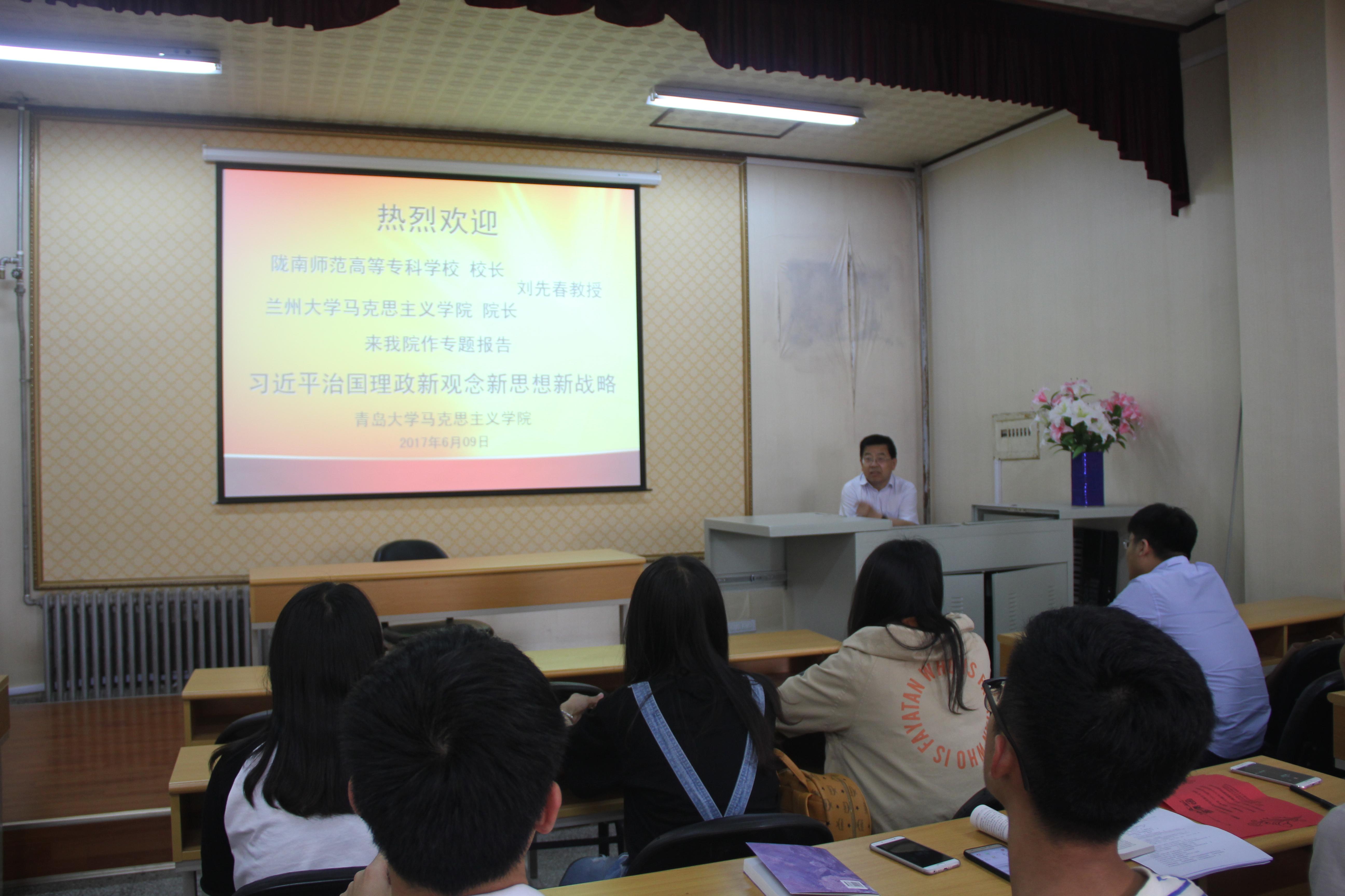 2017年6月9日下午,陇南师范高等专科学校校长、兰州大学Beat365唯一官方网站院长、博士生导师刘先春教授在Beat365唯一官方网站第一会议室,为学院师生做了题为“习近平治国理政新理念新思想新战略”的专题报告。在“一带一路”“四个全面”“五位一体”等重大问题上,结合自己的学思践悟,阐释了中华民族伟大复兴的中国梦。报告深入浅出、风趣幽默,受到老师和同学们的热烈欢迎。