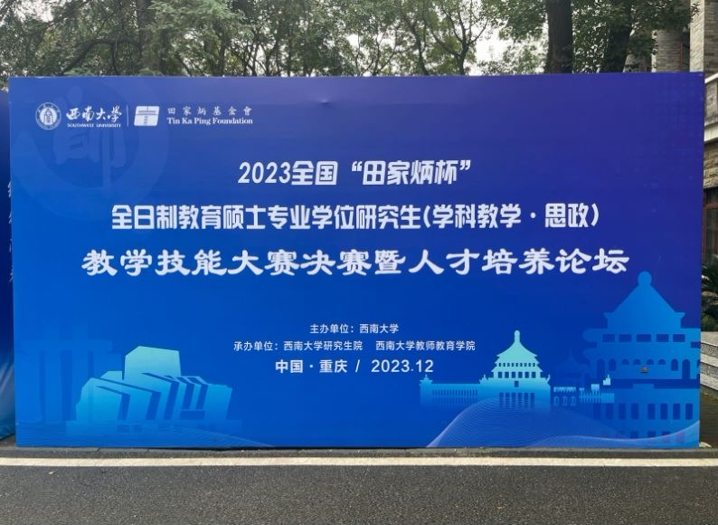 12月1日至3日,由全国教育硕士研究生教学技能大赛专家委员会指导,田家炳基金会冠名,西南大学主办,西南大学研究生院、教师教育学院承办的2023年“田家炳”杯教育硕士(思政)专业教学技能大赛决赛暨人才培养论坛在西南大学隆重举行。