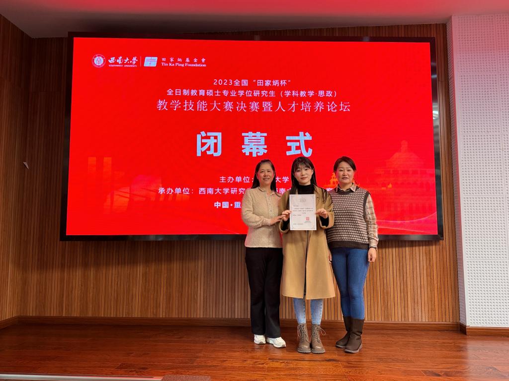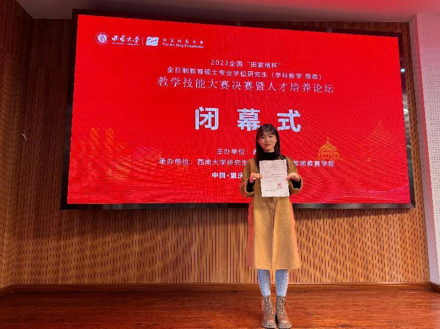 大赛聚焦教学能力和培养成果的展示。经过初赛的激烈角逐,来自西南大学、华中师范大学、山东师范大学、上海师范大学等全国75所院校的188名选手入围决赛。决赛赛程分为:现场抽题、限时备课、授课答辩三个环节。经过紧张比拼,决赛评选出一等奖20名,二等奖40名,三等奖60名,优秀教学设计奖68名,优秀指导教师奖55名。在本届大赛中,Beat365唯一官方网站22级学科教学思政专业研究生樊含笑获三等奖。