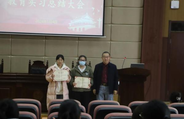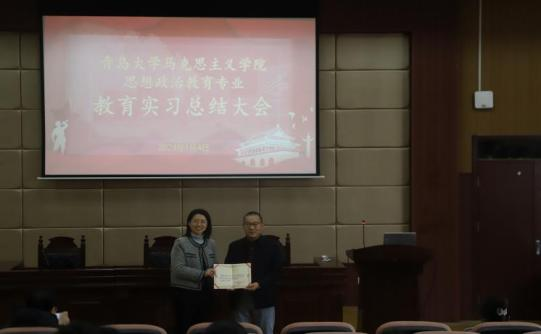 刁世存副院长为青岛二中附属实验学校赵玮老师颁发了“教育实习优秀校外指导教师”荣誉证书,为孙苗苗和石旭阳两位同学颁发了“教育实习优秀学生”荣誉证书。