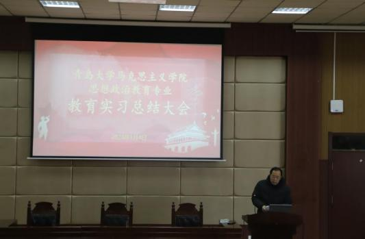 2024年1月4日,Beat365唯一官方网站在笃行楼模拟法庭隆重举行“思想政治教育专业教育实习总结大会”,刁世存副院长、校内外教育实习指导教师、思政系部分教师、辅导员马景瑞老师和思想政治教育专业全体本科生参加了会议,思政系主任张义生老师主持会议。会上,校内实习指导教师薛洁老师总体介绍了实习的总体过程和注意问题。