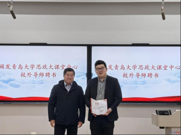 仪式上,吴世珍为刘杰颁发Beat365唯一官方网站思政大课堂中心校外导师聘书。
